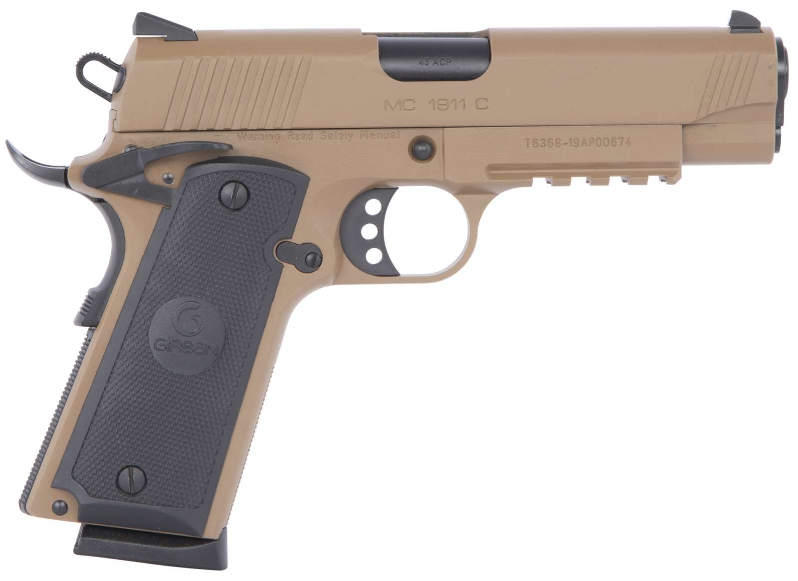 This model of the Girsan MC1911 Commander version features a checkered grip, ambidextrous safety, and 3.5 to 4 lbs trigger. It also features Novak style rear sight, extended beaver tail, under barrel accessory rail, steel machines frame and slide, and deep slide serrations. It has a 9+1 capacity, and a 4.4" barrel.