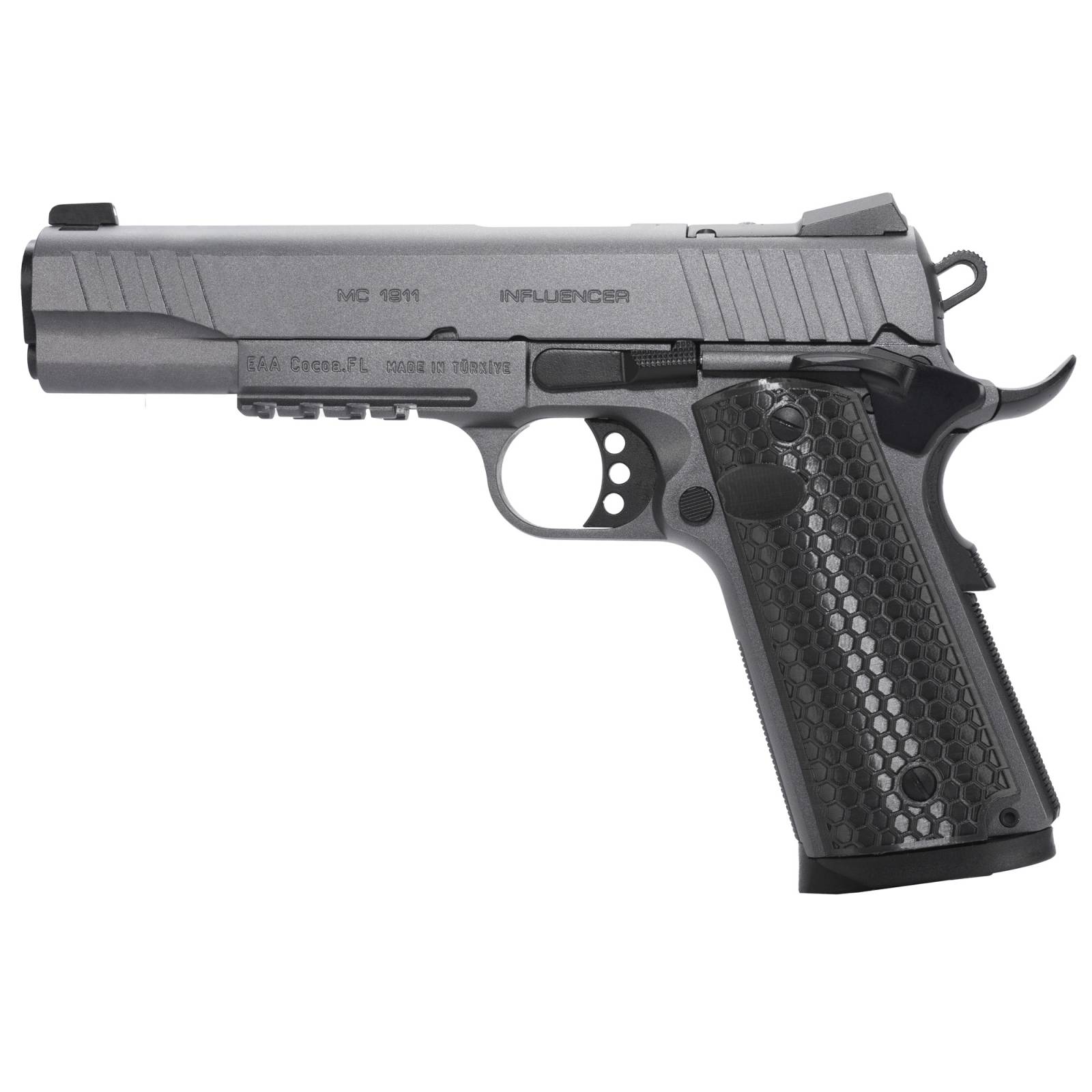 Girsan, MC1911S Influencer, 1911, Semi-Automatic, Metal Frame Pistol, Full-Size, 10MM, 5" Barrel, Optics Ready Slide, Steel, Tungsten Gray, Composite Grips, 3-Dot Sights, Ambidextrous Safety, 9 Rounds, 1 Magazine