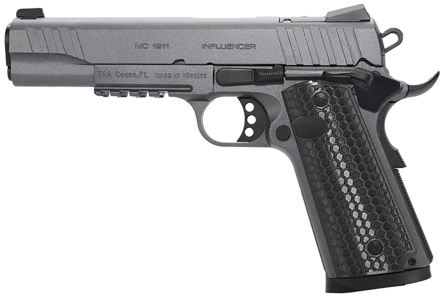 The MC1911 Influencer is designed to cater to a wide range of preferences.The pistol features an optic ready slide, RMS/RMSc; ambidextrous safety; adjustable sight; long hole hammer; accessory rail; enhanced trigger system and magazine well.