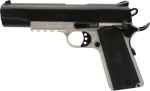 European American Armory MC1911S is a 1911 style semi-automatic pistol. It features government length barrel at 5”. Its steel frame makes gives just enough weight to reduce felt recoil and has a two tone finish of black and tan with black synthetic grips. It has an manual safety for safe carrying while loaded. Fixed Novak sights and an accessory rail round out this pistol. It comes with one 8 round magazine.