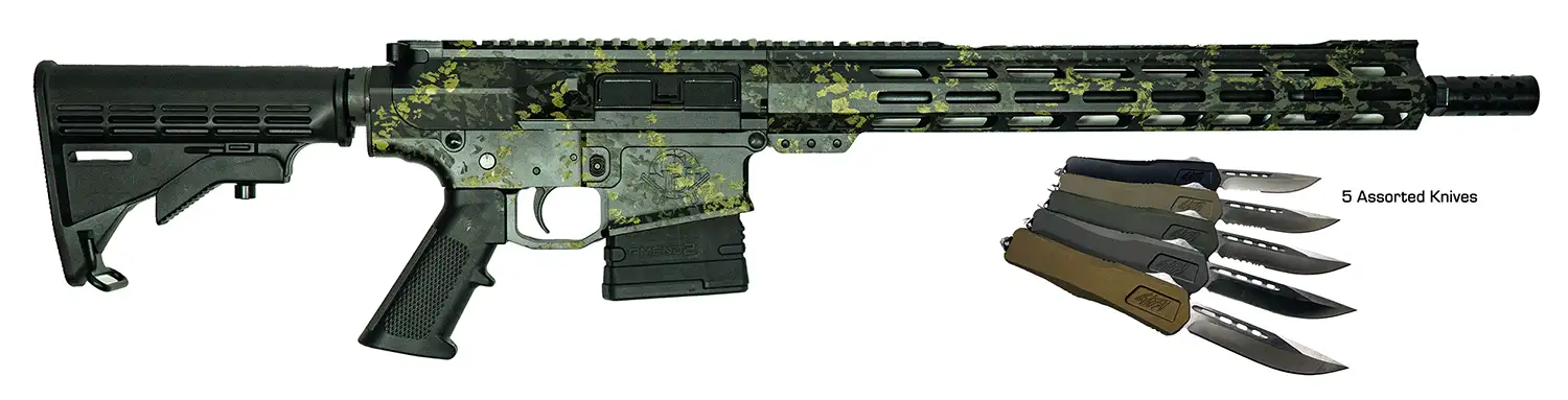 The GLFA AR10 rifles barrels have 5R rifling, as well as being double thermally stress-relieved and air-gauged. The rifle features a heavy barrel; rifle length gas tube; threaded barrel; aluminum receiver; M-LOK handguard; Picatinny rail and a Mil-spec trigger. Includes one magazine and 5 assorted SKU's of Out The Front style knives that feature a 3.50" D2 Steel blade and a 4.50" 6061 Aluminum Grip. These come with glass breakers, belt clip and feature a premium Cerakote finish in these colors- Black, Tungsten, Bronze, FDE, and/or OD Green. They may be serrated or smooth blades.