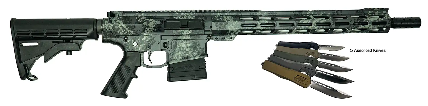 The GLFA AR10 rifles barrels have 5R rifling, as well as being double thermally stress-relieved and air-gauged. The rifle features a heavy barrel; rifle length gas tube; threaded barrel; aluminum receiver; M-LOK handguard; Picatinny rail and a Mil-spec trigger. Includes one magazine and 5 assorted SKU's of Out The Front style knives that feature a 3.50" D2 Steel blade and a 4.50" 6061 Aluminum Grip. These come with glass breakers, belt clip and feature a premium Cerakote finish in these colors- Black, Tungsten, Bronze, FDE, and/or OD Green. They may be serrated or smooth blades.