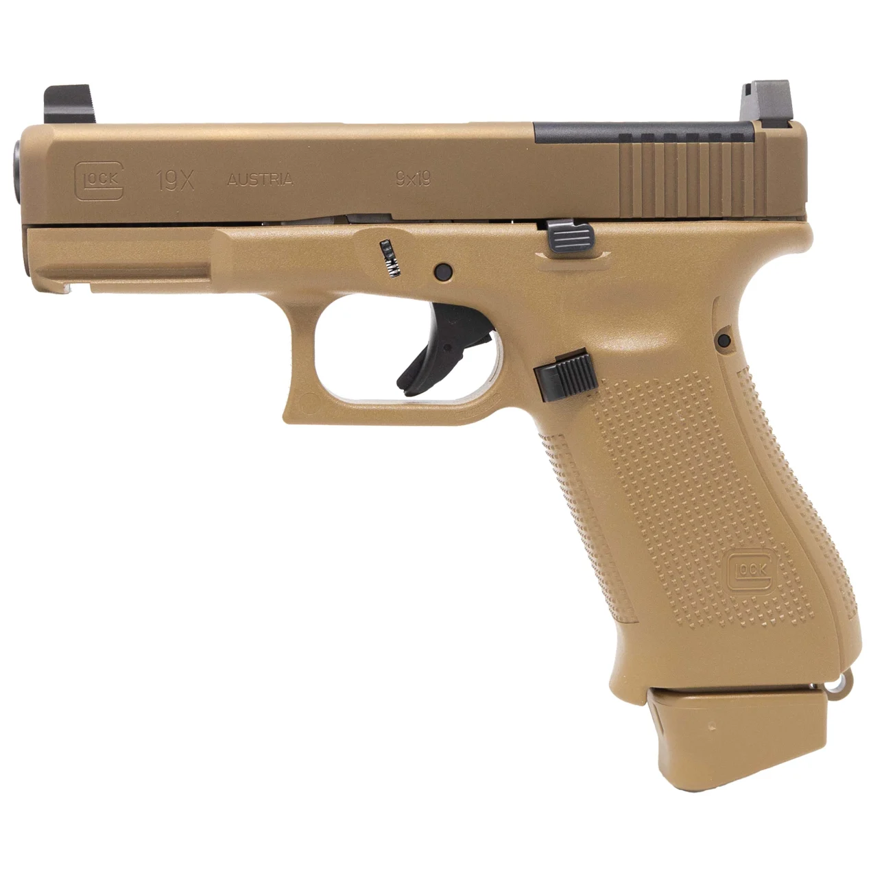 The GLOCK 19X MOS, combines the best features of two of its most popular and most trusted field-tested platforms. The full-size GLOCK 17 frame and the compact GLOCK 19 slide have joined forces to produce the ideal pistol for all conditions and all situations. The G19X MOS GLOCK enhances the desirability of the already near-perfect Gen5 model with the addition of the Modular Optic System (MOS). The slide is precision machined to provide a mounting system for popular optic sights. With multiple adapter plates, you can quickly and easily mount miniature electronic sights to the rear of the Gen5 GLOCK slide, which has front serrations for easier and quicker manipulations.The 19X MOS comes in the coyote color with an improved nPVD slide coating to prevent corrosion. Additional features include the GLOCK Marksman Barrel (GMB), no finger grooves, ambidextrous slide stop levers and lanyard loop. Included with the pistol is a standard 17-round magazine, two 17+2-round magazines and coyote-colored pistol case.