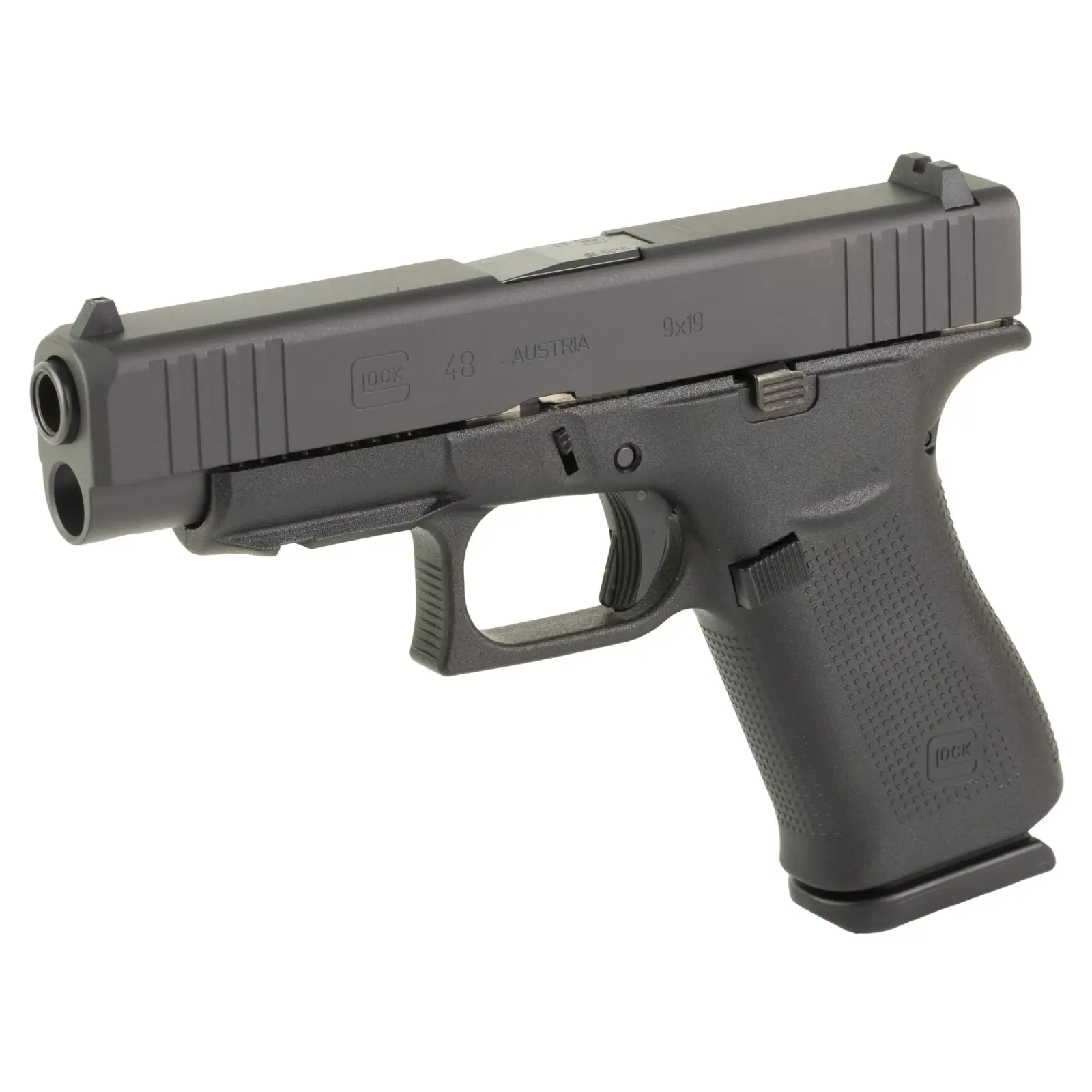 The Glock 48 Slimline Compact has built-in beaver tail, match-grade GLOCK Marksman Barrel (GMB) and precision-milled front serrations. It features Glock's Safe Action system which provides a consistent trigger pull from the first to the last round; three automatic independently operating mechanical safeties; polymer frame with hardened steel guides; ideal grip angle and low weight. The advanced surface treatment of the slide results in optimal hardness by considerably reducing wear and tear and it makes it corrosion resistant, even when operating in saltwater conditions. Includes 3 magazines, mag loader, cleaning set, pistol case and cable lock.