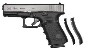 The Glock 19 pistol is ideal for use as a backup weapon or for concealed carry purpose. It features Glock's Safe Action system which provides a consistent trigger pull from the first to the last round. The three automatic independently operating mechanical safeties are built into the fire control system of the pistol. All three safeties disengage sequentially as the trigger is pulled and automatically reengage when the trigger is released. The frame is made of polymer with hardened steel guides. It features an ideal grip angle and low weight. The slide stop lever and the magazine catch are easily operated with the shooting hand. The advanced surface treatment of the slide results in optimal hardness by considerably reducing wear and tear and it makes it corrosion resistant, even when operating in saltwater conditions. The matte surface minimizes light reflection. The barrel is mechanically locked and cold-hammer forged. The Gen4 model features rough texture and interchangeable backstraps.
