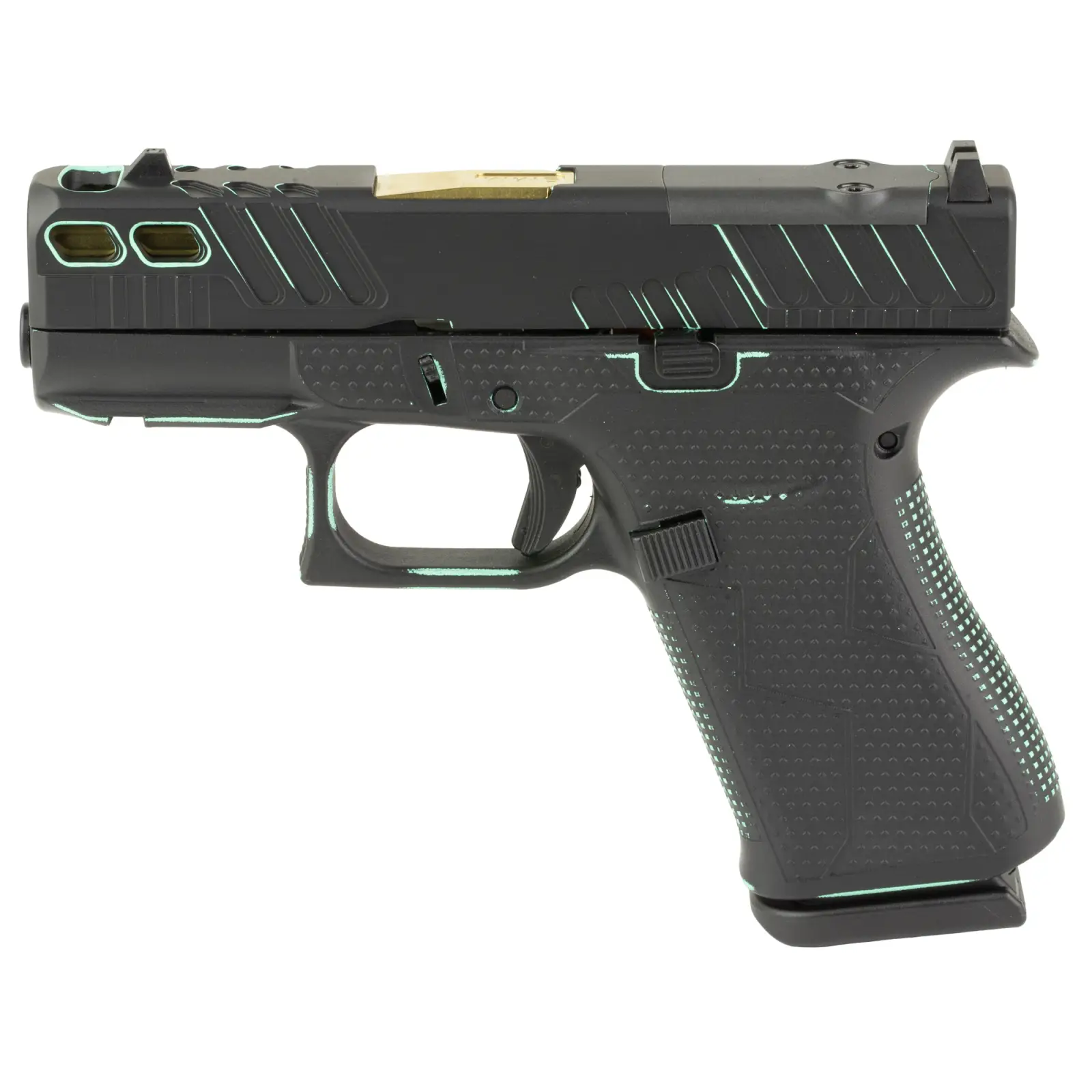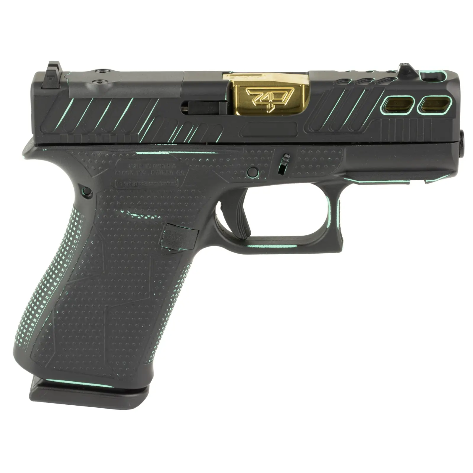 GLOCK, 43X, M.O.S, Striker Fired, Semi-automatic, Polymer Frame Pistol, Sub-Compact, 9MM, 3.41" Barrel, Custom Black and Robin's Egg Blue Cerakote Finish by Shark Coast Tactical, Fixed Sights, Optic Ready, Gold Barrel, 10 Rounds, 2 Magazines