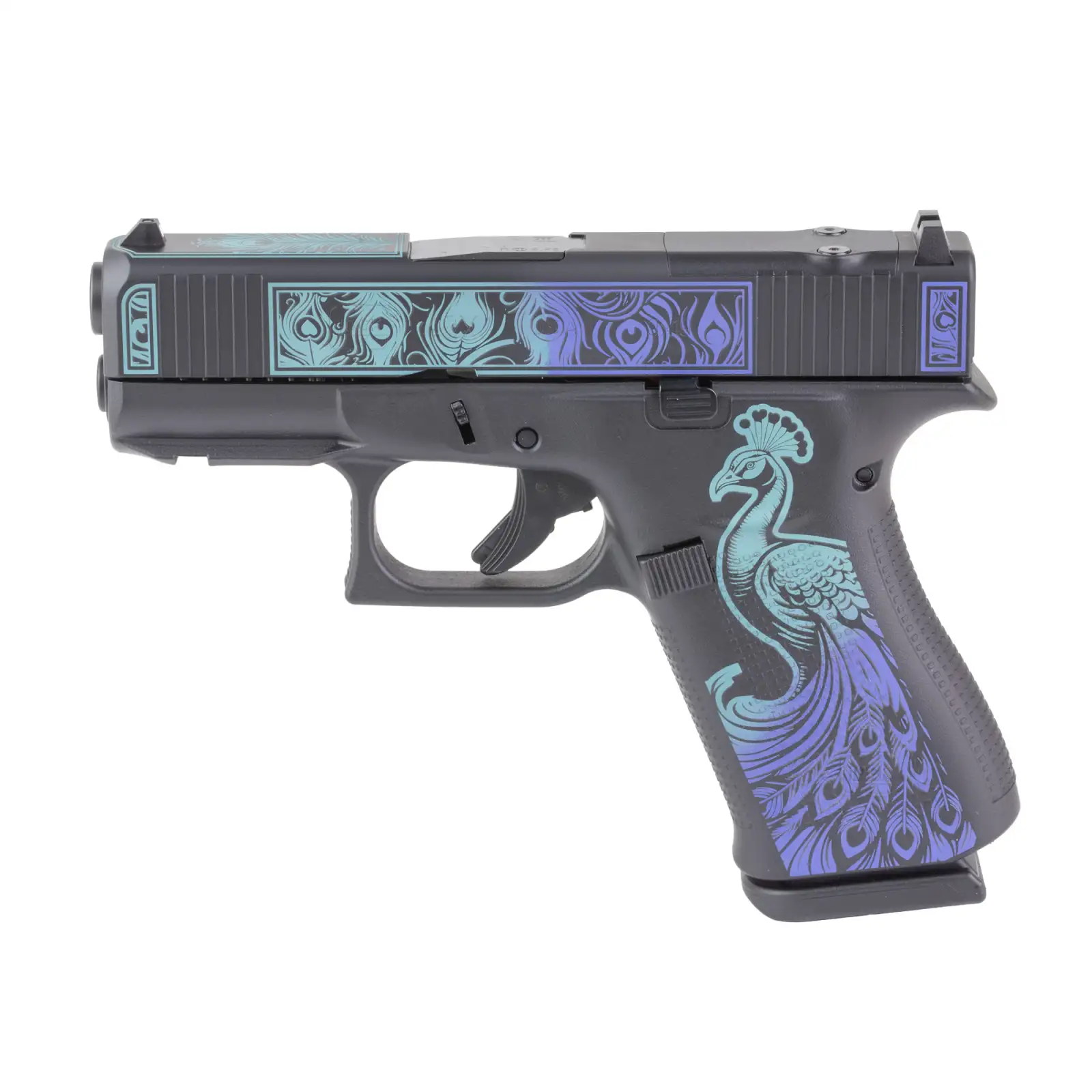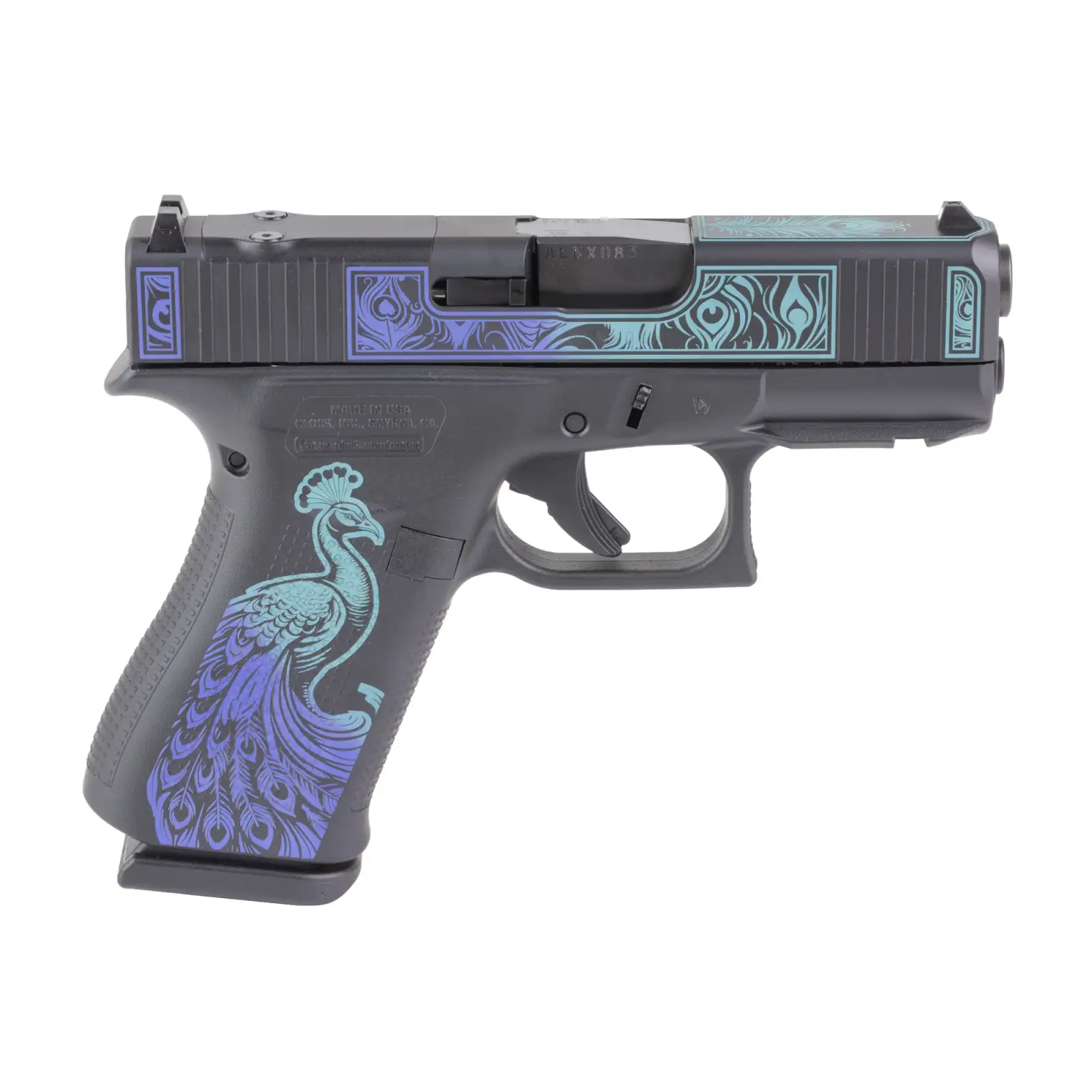 GLOCK 43X M.O.S., Semi-automatic, Striker Fired, Polymer Frame Pistol, Sub-Compact, 9MM, 3.41" Barrel, Custom Peacock Cerakote Finish by Shark Coast Tactical, Black, Blue and Teal, Fixed Sights, 10 Rounds, 2 Magazines UX4350204FRPEA-SCT