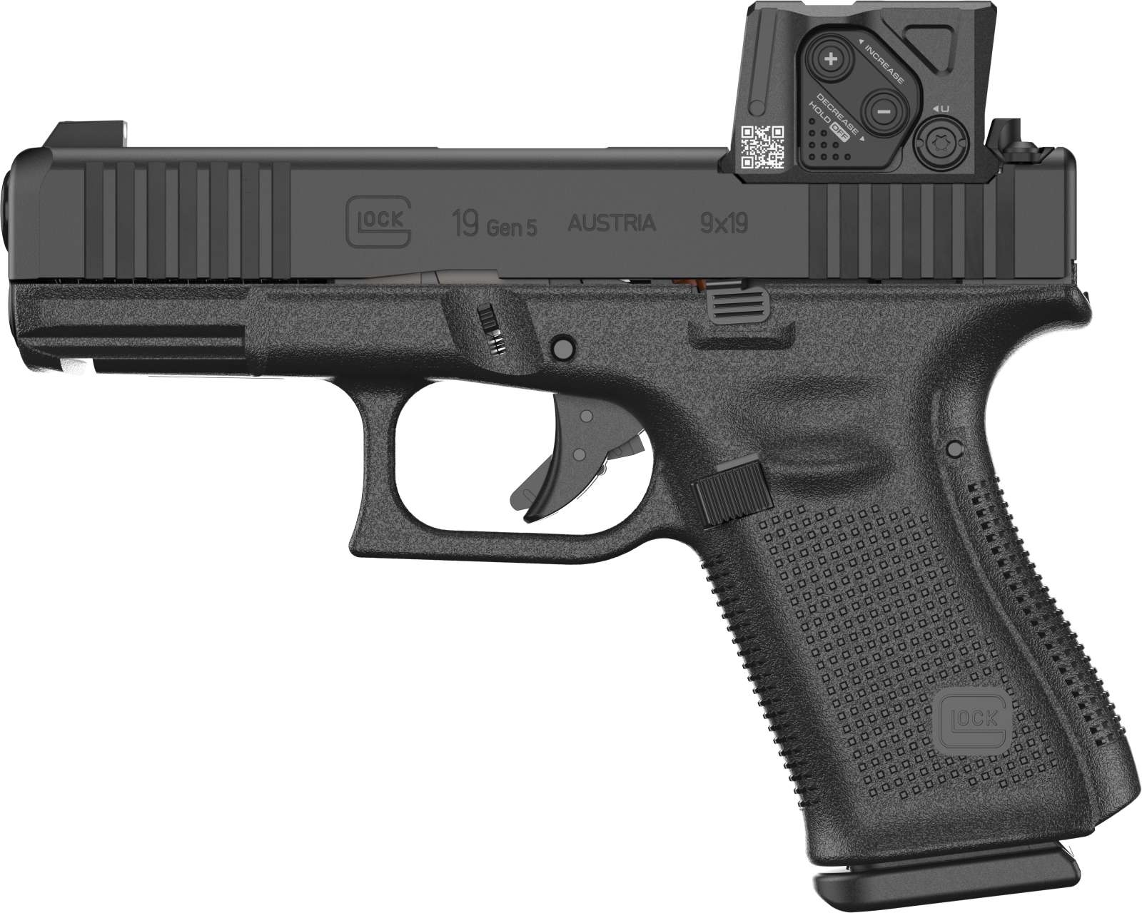 GLOCK, 19 M.O.S., Gen 5, Striker Fired, Polymer Frame Pistol, Compact, 9MM, 4.02" Marksman Barrel, nDLC Finish, Black, MOS8 Optic Cut, Aimpoint COA Optic Mounted, Black Front Sight, Rear Wedge Sight, Front Serrations, Ambidextrous Slide Stop Lever, Flared Mag Well, No Finger Grooves, 15 Rounds, 3 Magazines