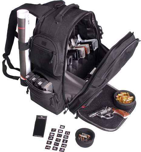 The Executive Backpack is designed for the shooter who needs to transport his handguns to and from the range without anyone knowing what is in the pack. The Executive has an removable foam cradle the holds five handguns securely inside the pack. This pack features 16 removable Visual I.D. icon patches to place where you want, and to help you store and protect your shooting accessories. Specialized pockets in the front of the bag are velour lined to protect fine shooting glasses and custom molded ear pieces. It also includes two ammo dump cups to hold bulk ammo and other small parts if needed. The Executive Backpack also features a computer storage pocket; the padded storage pocket will fit up to a 15" screen laptop while you travel. Pull out rain cover protects gear from a sudden rain and lockable heavy duty YKK zippers provide added security.