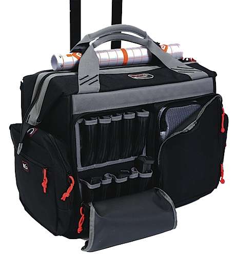 This bag features oversized ATV wheels and a wide mouth top opening and a telescoping handle for easy transport. All components of this storage system including storage pockets for eye and ear protection, targets, stapler, tape, binos, tools, cleaning supplies, extra magazines, and an innovative fold out vertical handgun holder. This handgun holder allows the shooter to store two medium or small frame handguns inside the bag in a secure vertical storage format that allows better organization at the range. They constructed this Rolling Range bag with the same strong materials used in making better grade luggage. A rigid internal frame with 6 metal rivets ensure it's long term durability.