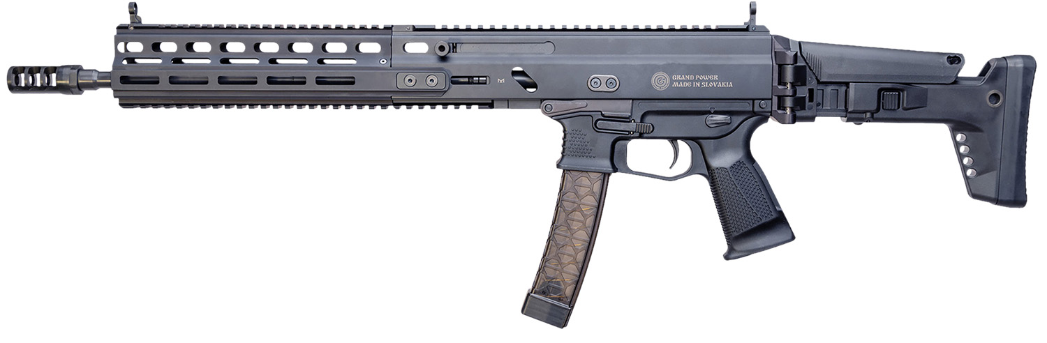 The Grand Power SP9A1 Stribog features an M-LOK handguard; Iron sights; ambidextrous bolt lock/release, thumb safety; non-reciprocating charging handle; grand power 59 muzzle brake; Picatinny rail receiver and Global Ordnance UFS stock.