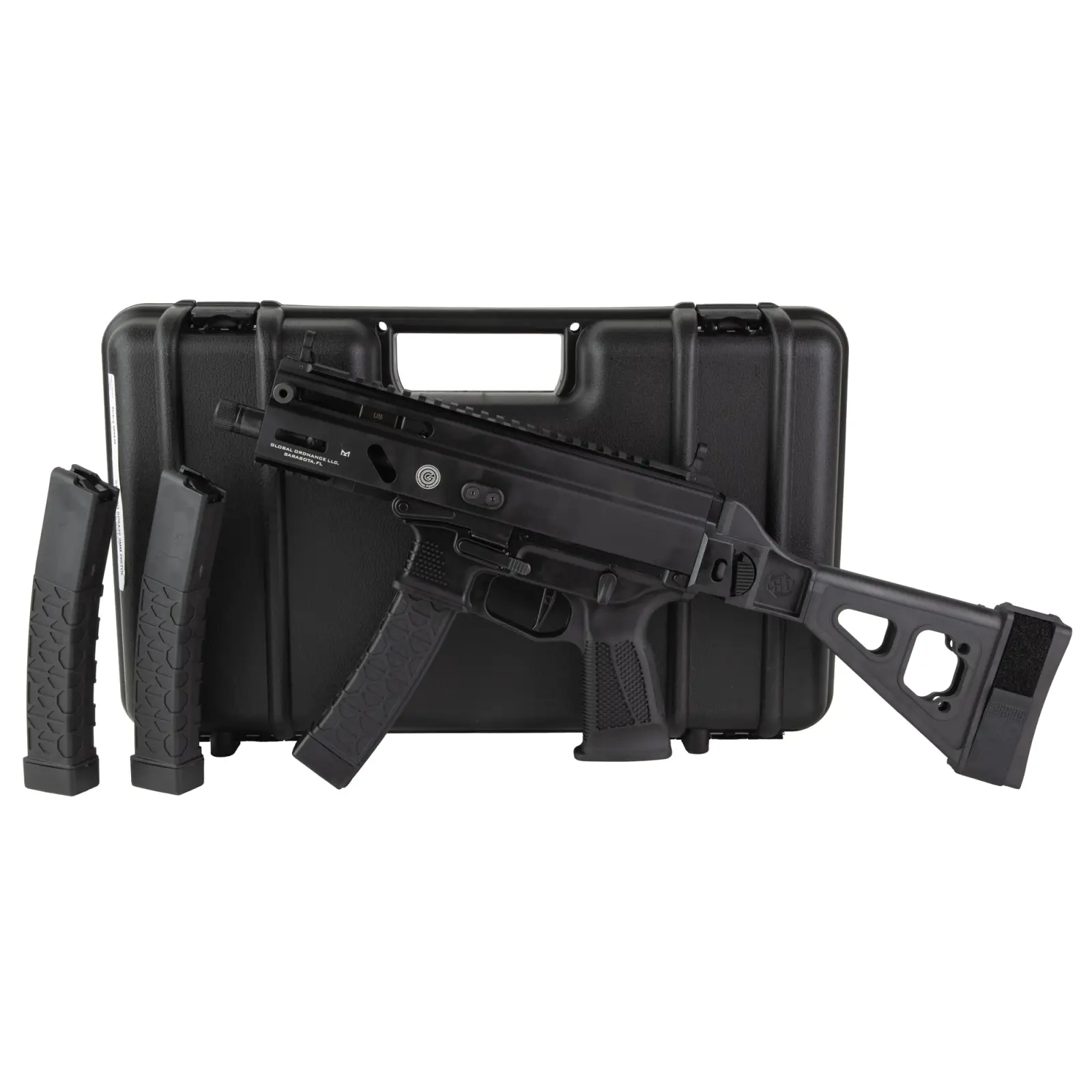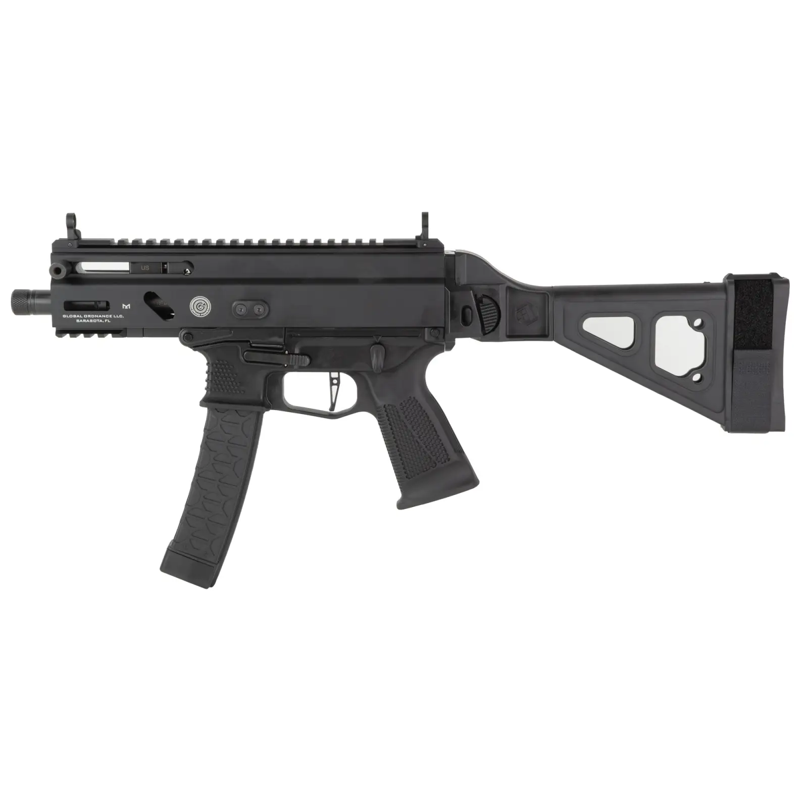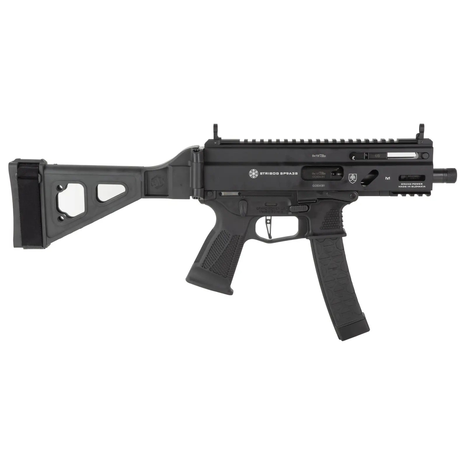 Grand Power, Stribog SP9A3S, Semi-automatic, Striker Fired, Alum Frame Pistol, 9MM, 5" Threaded Barrel, 1/2X28 Thread Pitch, Ambidextrous Controls, Folding Pistol Brace, M-LOK Handguard, Matte Finish, Black, 30 Rounds, 3 Magazines