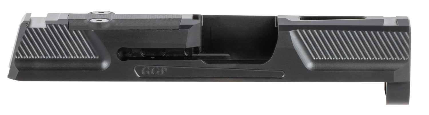 The GGP365 stripped slide is constructed of 17-4 stainless steel and comes cut compatible with the Shield RMS-C or SIG ROMEOZero micro red dot optics, with an attractive G10 coverplate for when a MRDS is not in use. This version 2 features a recessed area with fine serrations in front and rear.