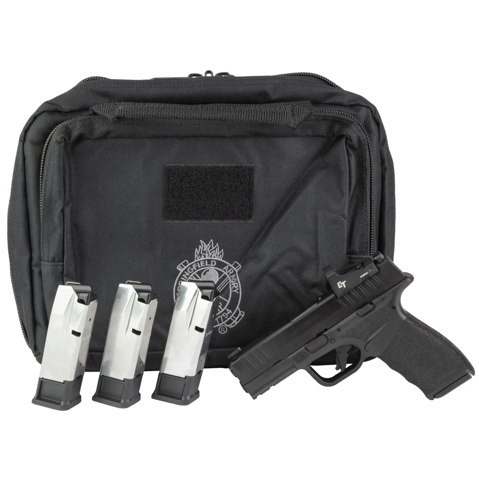 Springfield, Hellcat Pro, Striker Fired, Semi-automatic, Polymer Frame Pistol, 9MM, 3.7" Hammer Forged Barrel, Melonite Finish, Black Polymer Frame, Crimson Trace CT-1500 Red Dot Sight, Textured Grip, Tritium Front Sight, Tactical Rack Rear Sight, 10 Rounds, 5 Magazines, Includes Range Bag