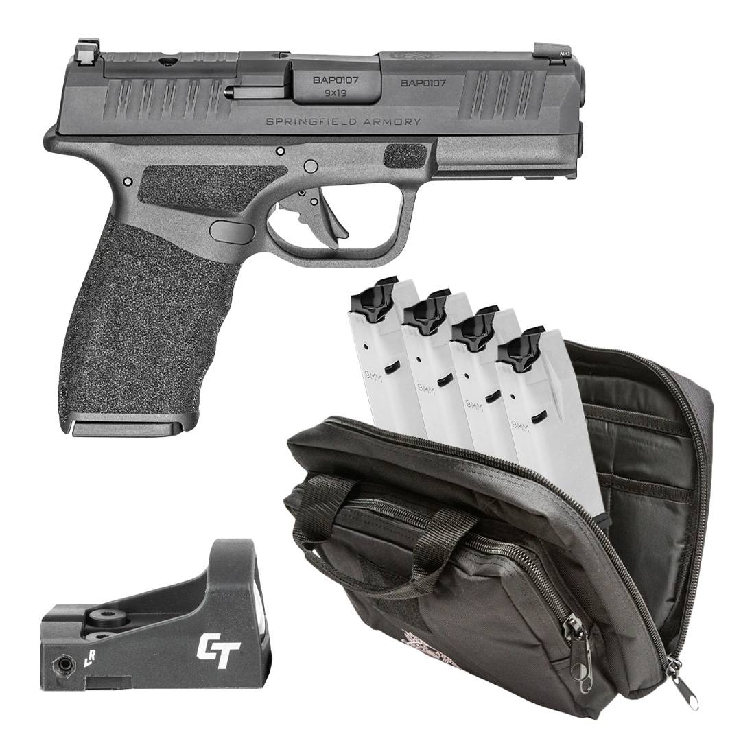 The Springfield Hellcat Pro OSP delivers full-size performance in a concealable, EDC-ready package. Featuring a slim-line grip; milled slide fitting the Springfield Micro footprint, designed to accept today's most popular micro red dots; hammer forged barrel; Sights- Tritium/Luminescent Front, Tactical Rack U-Notch Rear; versatile accessory rail on the frame provides users the flexibility to deploy a wide range of accessories; reversible mag release at the user level for ambidextrous usage. Gear Up 25 package includes Crimson Trace CT-1500 Red Dot Optic, 5 magazines and dual range bag.