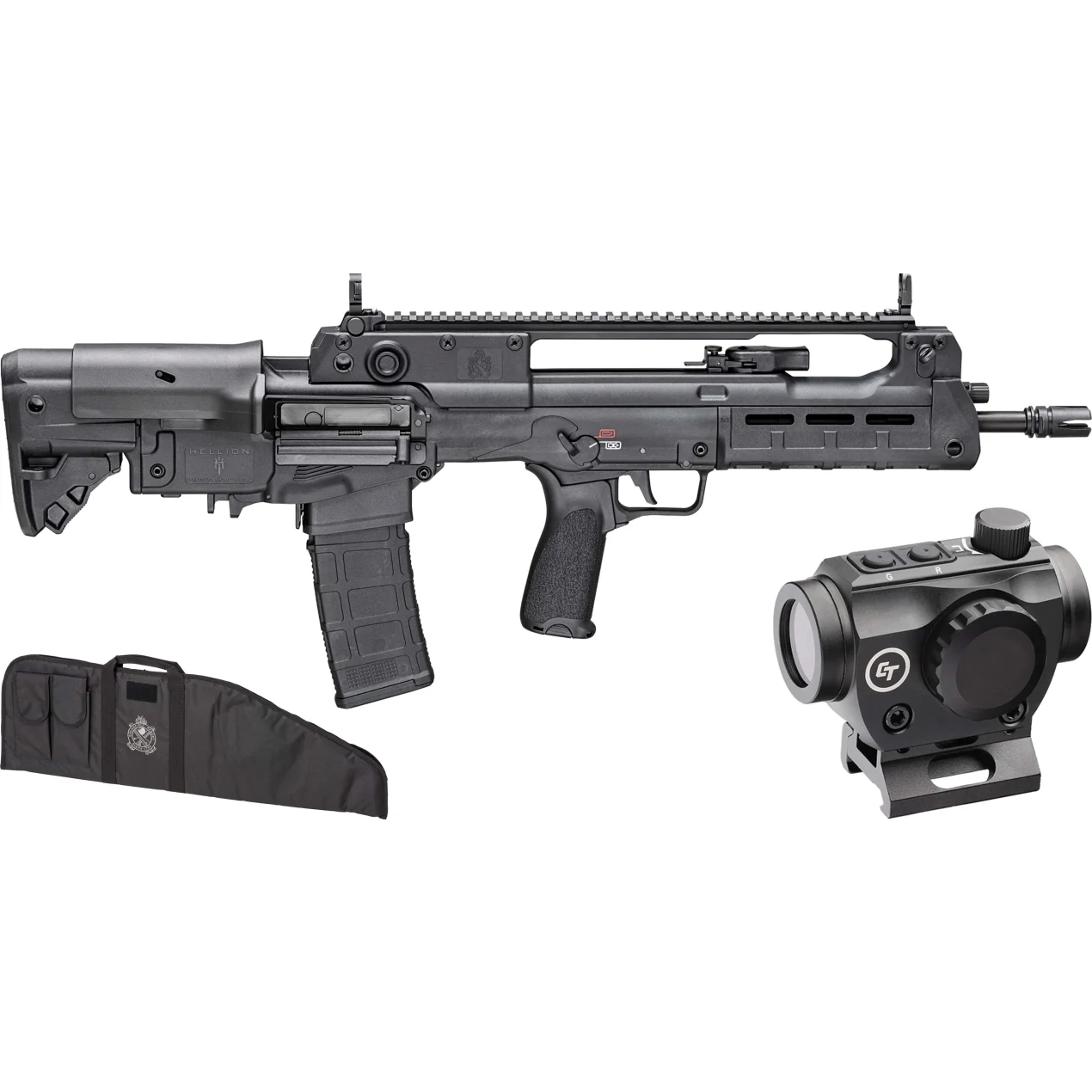 Springfield, Hellion, Semi-automatic, Bullpup, 223 Remington/556NATO, 16" Hammer Forged Barrel, 1:7 Twist, 4 Prong Flash Hider, Matte Finish, Black, Single Point Sling, Crimson Trace CTS-103 Red/Green Dot, BCM MOD 3 Grip, 5-Position Adjustable Stock with Cheek Riser, Front/Rear Flip Sights, 2-Position Short Stroke Gas Piston, Ambidextrous Safety, Ambidextrous Charging Handle, MLOK Handguard Reversible EjectionSystem, 30 Rounds, 2 Magazines
