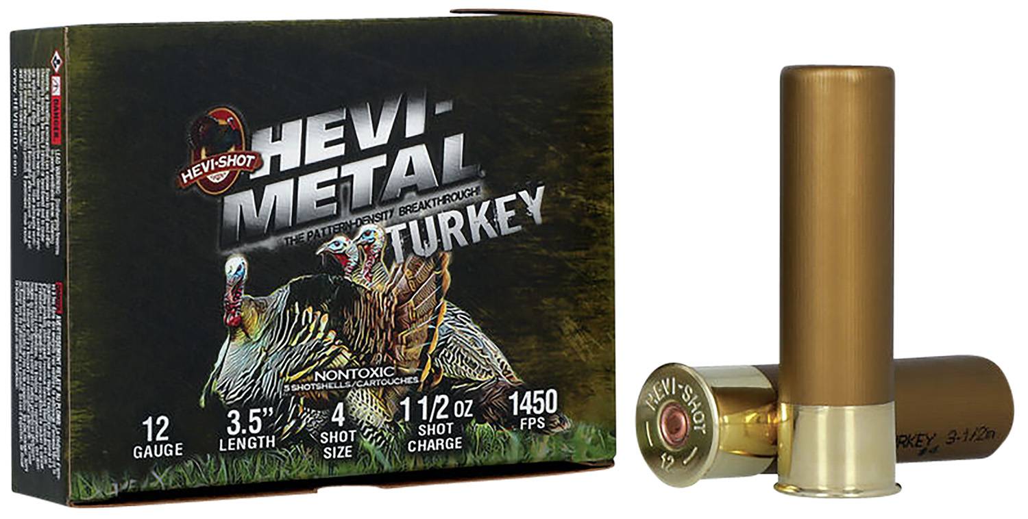 HEVI-Metal has a higher proportion of HEVI-Shot pellets than HEVI-Metal waterfowl shotshells, so a 1.25 oz HEVI-Metal Turkey shell has 263 pellets- about as many as a lead #4 shotshell with nearly 2 oz of shot (273 pellets). The maximized pellet count fills in your shot pattern, to help you bag your Tom every time.