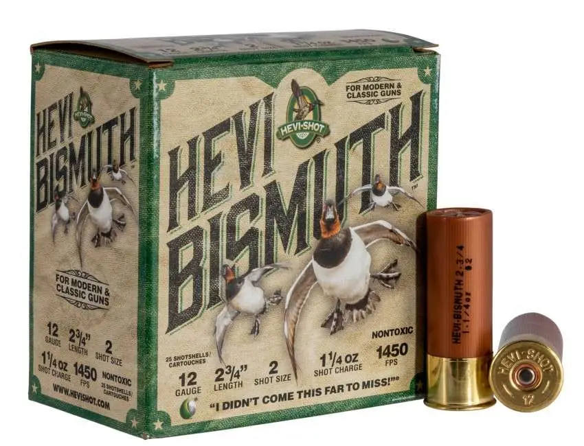 HEVI-Bismuth Waterfowl shells utilize bismuth, which is 22% denser than steel, to deliver more downrange lethality at an affordable price. And, its safe for older fixed choke and fine classic doubles shotguns.