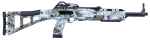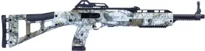 Hi-Point produces affordable, American-made firearms featuring 100% American parts and assembly. The 4595TS 45ACP carbine has an all-weather, polymer skeletonized stock with an internal recoil buffer, multiple Weaver-style rails, a sling, swivels, and scope base. It has a quick on/off thumb safety, grip-mounted magazine release, and fully adjustable sights (post front, peep rear). Hi-Point carbines are +P rated and accept all factory ammunition. This model has a Mothwing Winter Mimicry design on the frame with black controls.