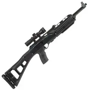 Hi-Point's 4595TS 45 ACP carbine has an all-weather, polymer skeletonized stock with an internal recoil buffer, multiple Weaver-style rails, a sling, swivels, and scope base. It has a quick on/off thumb safety, grip-mounted clip release, last round lock open feature, and fully adjustable sights (post front, peep rear). The 4595TS carbine has a 17.5" barrel for an OAL of 32". Hi-Point produces affordable, American-made firearms featuring 100% American parts and assembly. Hi-Point carbines are +P rated and accept all factory ammunition. This model features a 4x32mm scope. It has a black stock with black metal finish and includes a 9-round magazine.
