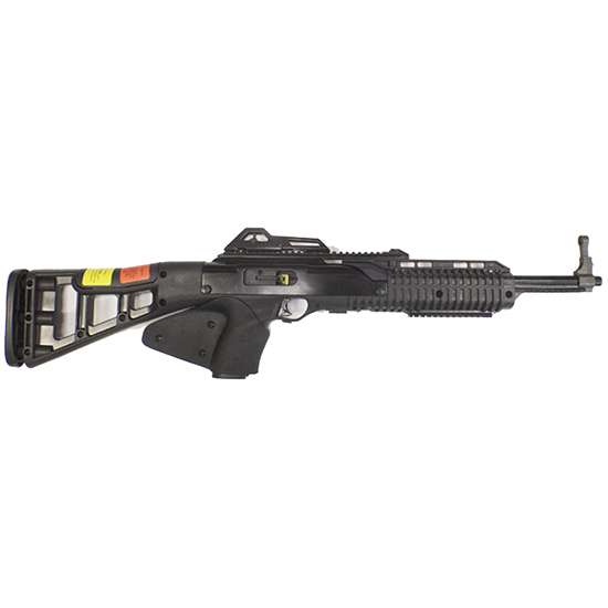 Hi-Point's 995TS 9mm carbine has an all-weather, polymer skeletonized stock with an internal recoil buffer, multiple Weaver-style rails, a sling, swivels, and scope base. It has a quick on/off thumb safety, grip-mounted clip release, last round lock open feature, and fully adjustable sights (post front, peep rear). The 995TS carbine has a 16.5" barrel for an OAL of 31". Hi-Point produces affordable, American-made firearms featuring 100% American parts and assembly. Hi-Point carbines are +P rated and accept all factory ammunition. This CA compliant model has a black stock with CA paddle grip, black metal finish and includes a 10-round magazine.