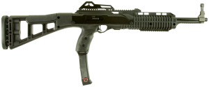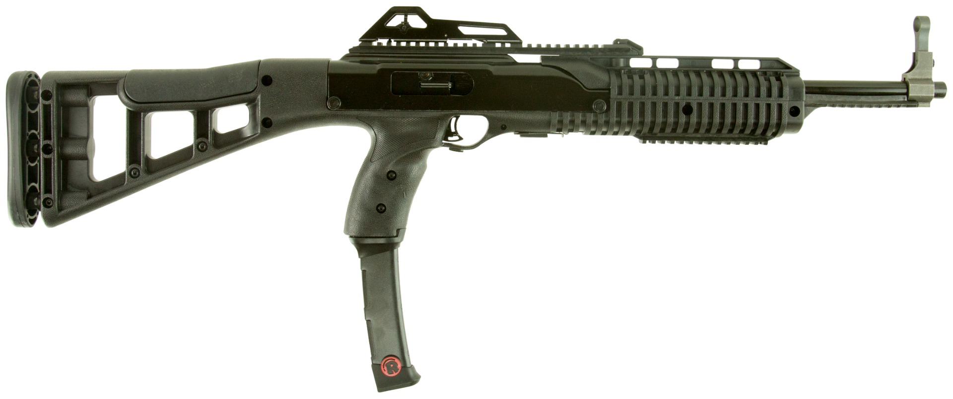 Hi-Point's 995TS 9mm carbine has an all-weather, polymer skeletonized stock with an internal recoil buffer, multiple Weaver-style rails, a sling, swivels, and scope base. It has a quick on/off thumb safety, grip-mounted clip release, last round lock open feature, and fully adjustable sights (post front, peep rear). The 995TS carbine has a 16.5" barrel for an OAL of 31". Hi-Point produces affordable, American-made firearms featuring 100% American parts and assembly. Hi-Point carbines are +P rated and accept all factory ammunition. This model features a forward folding grip. It has a black stock with black metal finish and includes (2) 20-round Redball magazines.