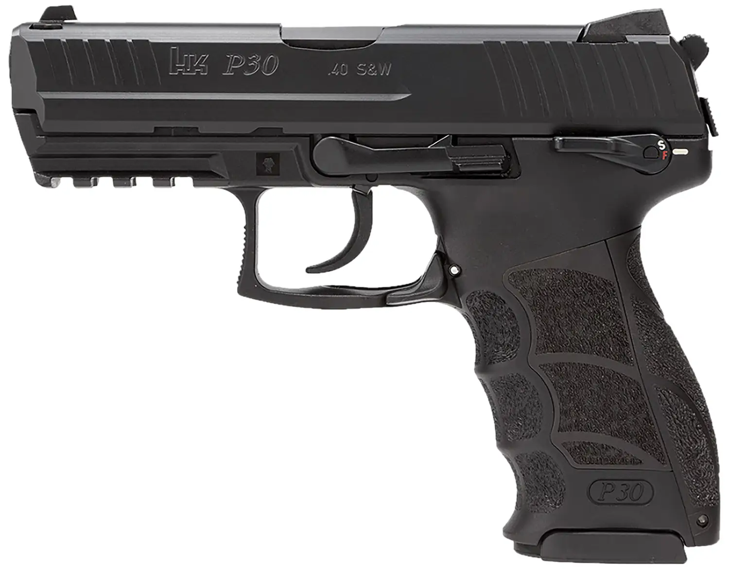 The P30 was designed as a modern police and security pistol combining optimal function and safety. The V3 models feature HK's DA/SA trigger. Ambidextrous controls include dual slide releases, safety, rear decocking button, magazine release levers. Ergonomic features include a grip frame with interchangeable backstrap inserts and lateral plates, allowing the pistol to be adapted to any user. Includes two 10rd magazines.