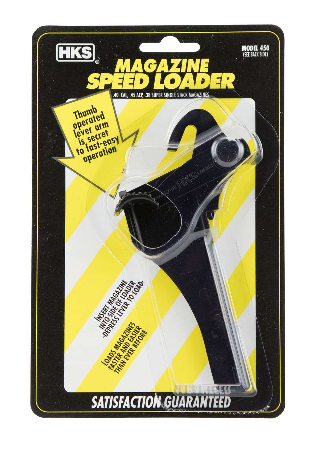 This thumb-operated lever arm pistol speed loader is secret to fast and easy operation. No sore fingers. No fatigue. Capable of loading 15 rounds in 18 seconds, single or double stack mags. Works equally well right or left handed.