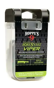 The original fastest bore cleaner on the planet has a new home. Hoppe's BoreSnake Den is a compact carrying case with a built in handle for easy storage between firearm cleanings. It conveniently fits in a range bag or backpack to protect your Boresnake brushes during transport. The lid of the Snake Den doubles as convenient pull handle that snaps into the clear case for storage. A one pass solution, BoreSnake uses an integrated bronze brush to scrub out carbon fouling, while the tail clears the barrel of loose debris with a surface area 160x larger than a standard patch.