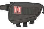 Padded cheek piece with exterior elastic loops for 5 additional cartridges. Keeps rounds clean secure and easily accessible. Features adjustable velcro straps and Hornady logo. Will accommodate most centerfire rifle cartridges.