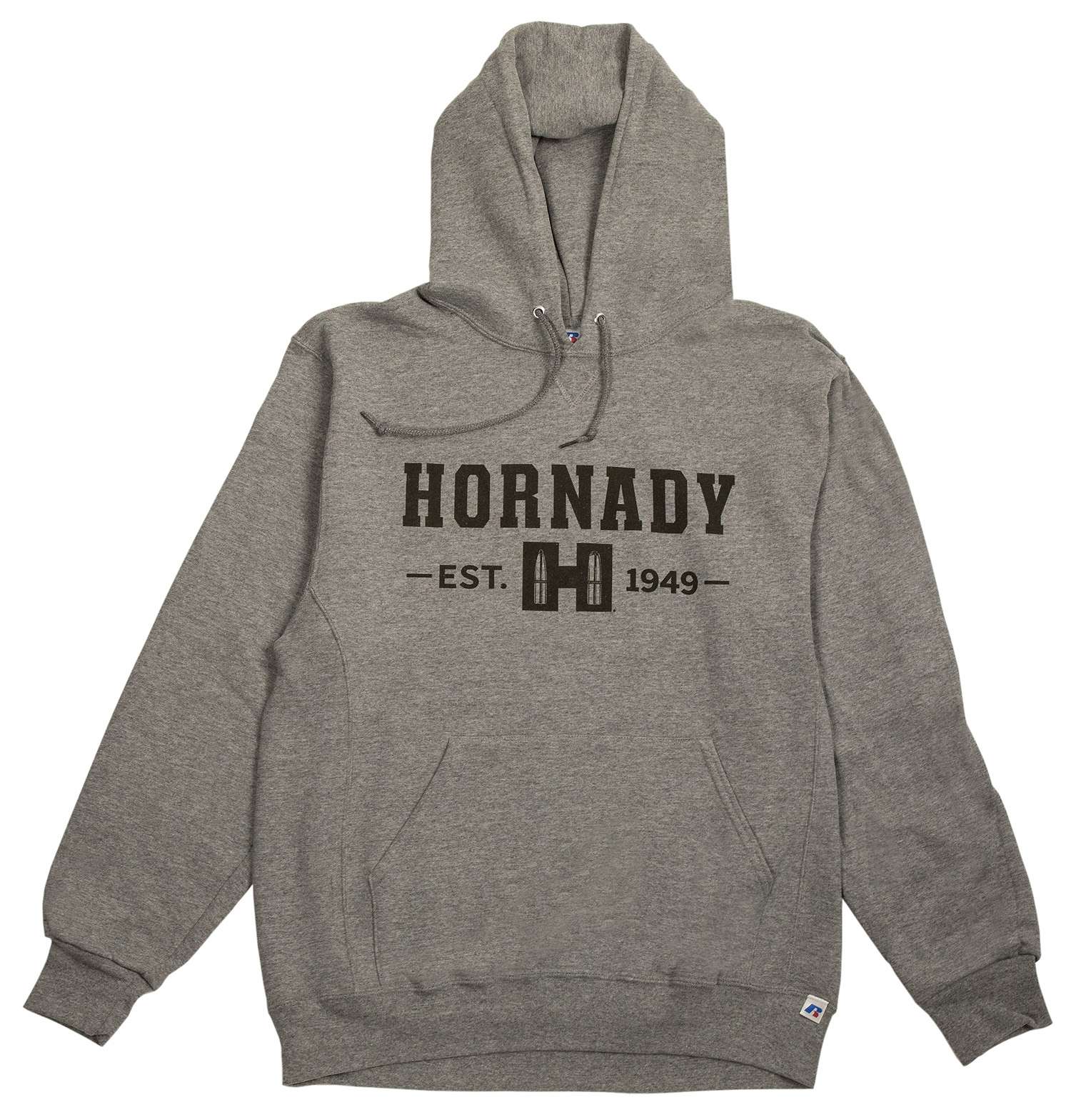 Hornady Hoodie gray with black logo, 52% polyester/48% cotton.