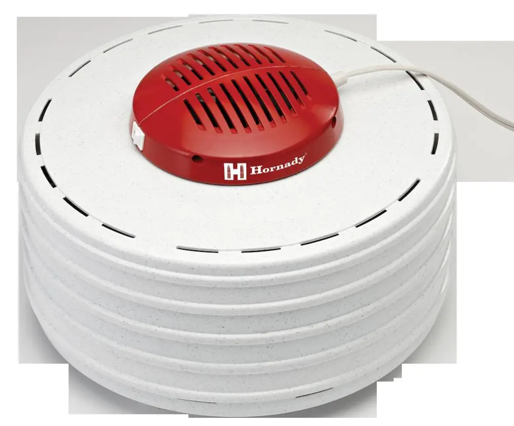 Hornady has an innovative top-mounted power head that dries cases and gun parts quickly and easily, the Hornady Case & Parts Dryer features multiple levels for increased capacity. It has three trays and a spacer for taller parts, the Case & Parts Dryer is quickly disassembled for easy clean up. It features a 4" top mounted fan/heater (400 Watts, 120 Volts), three (3) trays, and a large parts spacer. It has a case capacity of 720 for 9mm, and 375 for 223 Rem. The dimensions are 9.25" H x 14" Diam and 3.4 lbs in weight. The dry time can range from 1-3 hours depending on load.