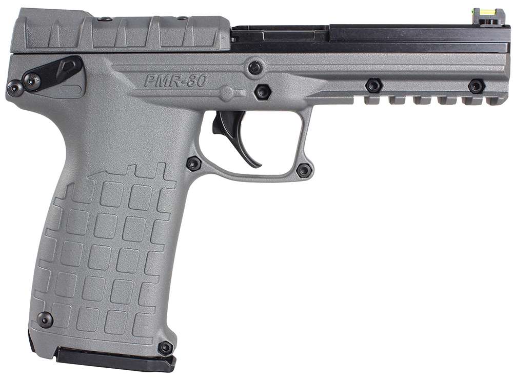 The PMR-30 is a lightweight, full size pistol (.22WMR). The PMR-30 operates on a unique hybrid blow back/locked-breech system, allowing for the use of a wide variety of ammunition as it seamlessly adjusts depending on the pressure of the cartridge. It uses a flush fit, double stack Zytel nylon magazine with round count ports. The trigger is a crisp single action with an over travel stop. It has a thumb-activated ambidextrous safety lever. The slide locks back after the last shot and a manual slide lock lever is also provided. The slide and barrel are 4140 steel, the frame is 7075 aluminum. The grip, slide cover, trigger, mag release, and safety levers are glass reinforced nylon (Zytel). Other features include: dual opposing extractors for reliability, heel magazine release to aid in magazine retention, dovetailed aluminum front sight, Picatinny accessory rail under the barrel, urethane recoil buffer, and captive coaxial recoil springs. It has a fluted barrel for light weight and effective heat dissipation. PMR30 disassembles for cleaning by removal of a single pin. This exclusive model has a Tactical Gray grip, frame, and slide cover finish with a black slide.