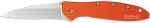 This Leek features an orange anodized-aluminum handle that has a fade-resistant, scratch-resistant dye that permanently is bonded to the aluminum. The business end of the knife is a task-ready 3" blade of Sandvik 14C28N stainless steel, a steel designed in a partnership between Kershaw and Sandvik. This high-performance steel enables Kershaw to make the Leek's blade razor sharp out of the box. The modified drop-point blade shape makes it a good slicing knife, while the slim tip gives it excellent piercing and detail work capabilities. Whether you're left or right handed, it's easy to open your orange Leek with SpeedSafe assisted opening. A simple pull back on the ambidextrous flipper and the Leek's blade is ready to go to work. For safety, a locking liner keeps the blade locked open during use and a Tip-Lock slider locks it closed when folded. The pocket clip is reversible for tip-up or tip-down carry and the handle is drilled to accept a lanyard. Made in the USA.