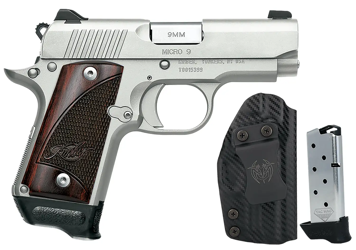 All Micro frames are shaped from aluminum for integrity and strength. In many respects a micro 1911, among the most important Micro 9 design advantages is a single action trigger with the kind of short, smooth pull that ensures accuracy and builds confidence. The thumb safety, slide release and magazine release are pure 1911 as well. Standard features include a lowered and flared ejection port for flawless ejection and a beveled magazine well for fast, positive loading; steel sights mounted in machined dovetails for additional integrity. Includes two Tac-Mags and a UM Tactical holster.