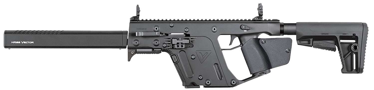 The KRISS Vector CRB is the non-NFA, semi-automatic, carbine variant with a 16" barrel. Additional standard equipment on the KRISS Vector CRB are the flip sights, full-length picatinny top rail, lower picatinny accessory rail, and a Glock magazine. This 9mm model CRB has a maglock for CA compliance.