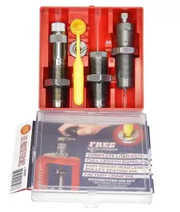 Lee's PaceSetter 3-Die Set includes a Full Length Sizing Die, Easy Adjust Dead Length Bullet Seating Die, Factory Crimp Die, Universal Shell Holder, Powder Dipper and instructions/load data.