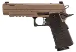 Designed for performance, the Apollo 11 includes an innovative recoil reduction system and aggressive grip texture for enhanced control during rapid fire. Its elite Flat Dark Earth slide comes optic-ready with an RMSc cut, allowing quick installation of micro red dot sights. Additional features like a grip safety, ambidextrous manual thumb safety, and accessory rails provide versatility for tactical attachments such as lights and lasers. The durable finish resists wear and corrosion, ensuring this pistol will perform reliably over time. It comes complete with a magazine and a soft case for secure storage and transport.