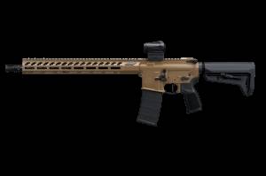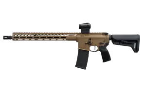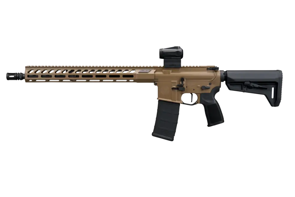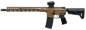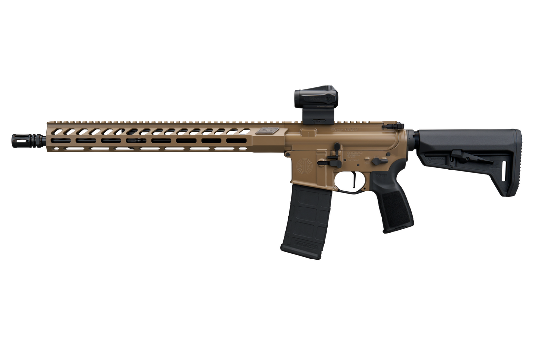 The SIGM400 5.56 NATO RIFLE is a 16-inch semi-automatic AR-platform configuration featuring a Romeo-MSR Gen II optic, a telescoping stock, an aluminum M-LOK handguard, and an FDE finish. The package includes one 30-round magazine.