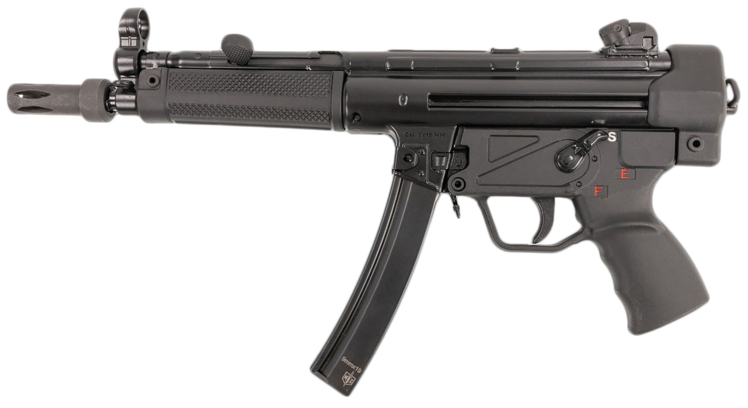Takes standard MP5 magazines. Includes two 30rd magazines, Tri-Lug flash hider, cleaning kit and sling.