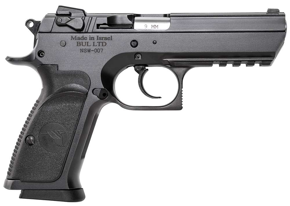 The Baby Eagle 3 is a 9mm caliber double/single action pistol. This handgun features a 4.43 inch barrel along with a carbon steel frame and slide finished with a black oxide coating. It also features a combat type 3-dot sight set up and two 10 round magazines.