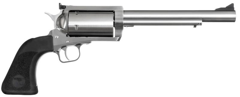 MRI's Big Frame Revolver is the biggest, finest revolver on the market today. Entirely manufactured in the US, it is designed as a magnum from the ground up. The BFR is all stainless and has a cut rifled barrel that delivers unmatched accuracy with lead or jacketed bullets. The BFR is the most powerful production single action gun made. With multiple calibers to choose from, you can take everything from grouse to grizzly. This model has a long cylinder, brushed stainless steel finish with black rubber grips, and comes with a Weaver-style scope mount.