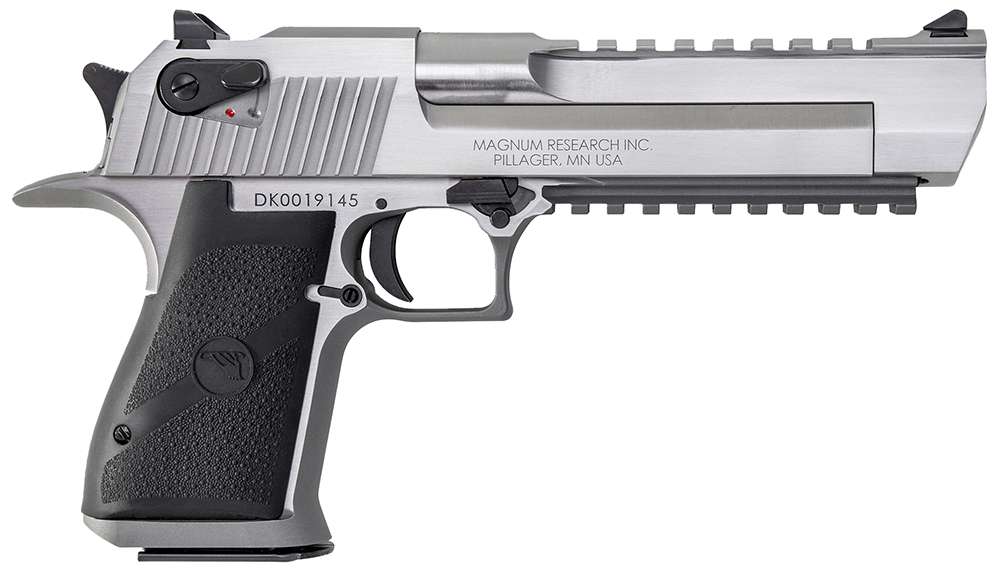 The Magnum Research Desert Eagle is constructed of high quality stainless steel. It has a 6" stainless steel barrel, bottom Picatinny rail and a full Weaver style rail on top. This model is a 50 Action Express with a 7-round magazine and stainless steel metal finish.