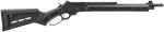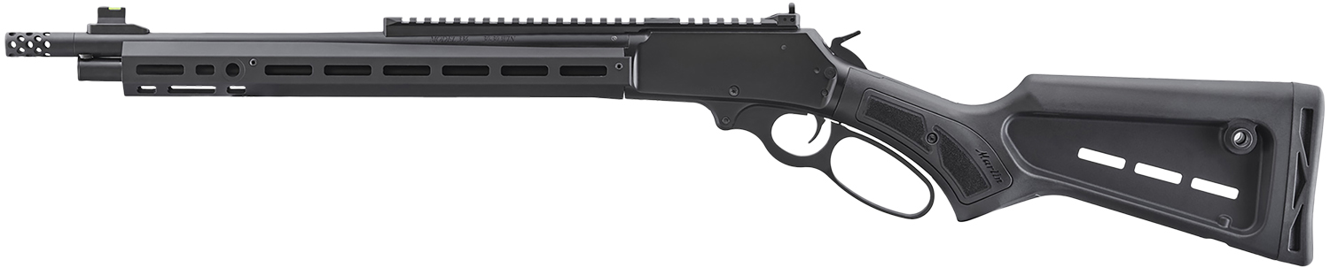The Marlin 336 Dark Series features a threaded barrel, with factory installed match polished radial muzzle break; Nylon reinforced polymer stock with M-LOK attachment slots; cheek riser included for an optimum sight picture when using an optic; Picatinny rail; Fiber optic front sight with a tritium ring; aluminum handguard features M-LOK; Flush cup sockets for QD sling swivels; positive, push-button, cross-bolt manual safety and traditional half-cock hammer. Includes thread protector.