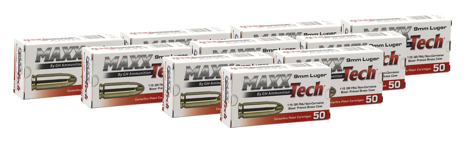 The MaxxTech 9mm 115 Grain Full Metal Jacket (FMJ) 500 Round Bundle is designed for reliable, high-volume shooting. Each round features a 115-grain FMJ bullet, making it ideal for target practice and training. The brass-cased, boxer-primed cartridges are reloadable, adding value for shooters who handload their ammunition.