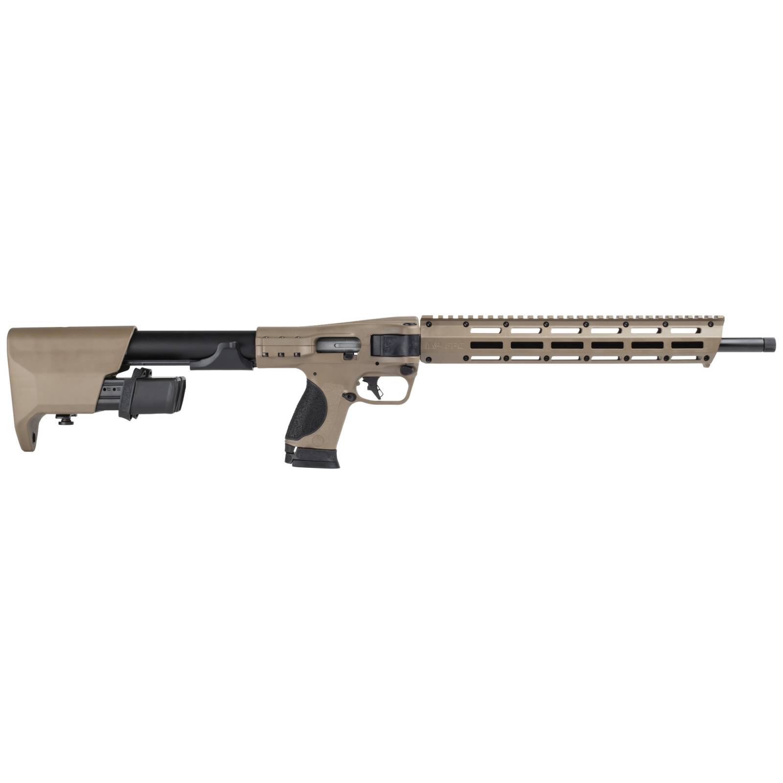 Smith & Wesson, M&P FPC Special Makeup, Semi-automatic Folding Carbine, 9MM, 18.6" Barrel, Threaded 1/2X28, Cerakote Finish, Flat Dark Earth, Flat Faced Trigger, (4) Interchangeable Palmswell Grip Inserts, Free Float M-LOK Handguard, Optics Ready, Fixed Stock Stores (2) Magazines, 3 Magazines, (2)-23 Round and (1)-17 Round.