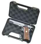 Accommodates all pocket sized handguns with barrel lengths of 3" or less. Handguns are held secure between tow pieces of protective foam padding. Padlock tabbed to detour undesired opening.