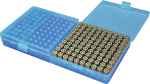 MTM's P-100 series pistol boxes have proven particularly popular with law enforcement personnel competitive shooters varmint hunters and weekend plinkers. Each box holds 100 rounds in absolute security from moisture and dust. The specially grooved lid is designed to match up with the feet on the bottom so they nest into each other. Each P-100 is supplied with its own load label for recording custom loads.