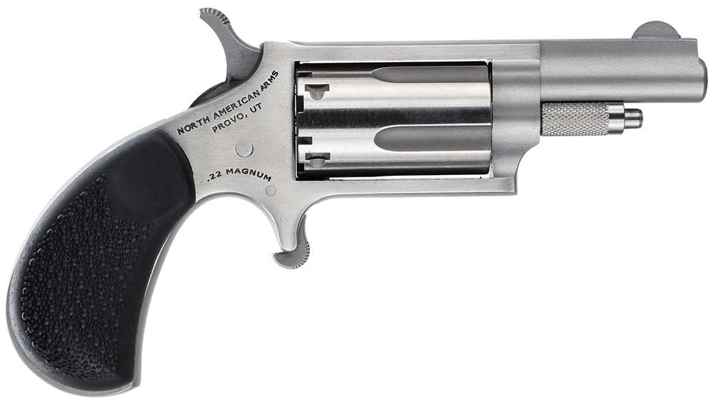 NAA'S Mini Revolver is small, easy to conceal and safe to carry. This gun is lightweight and has a 5-shot capacity. Using the half-way notch cylinder, the hammer may rest safely and securely away from live or empty chambers without chance of accidental discharge. It has black, textured rubber grips, a 1-5/8" barrel, and a stainless steel metal finish. This 22 Magnum Carry Combo model includes a strong side carry holster.
