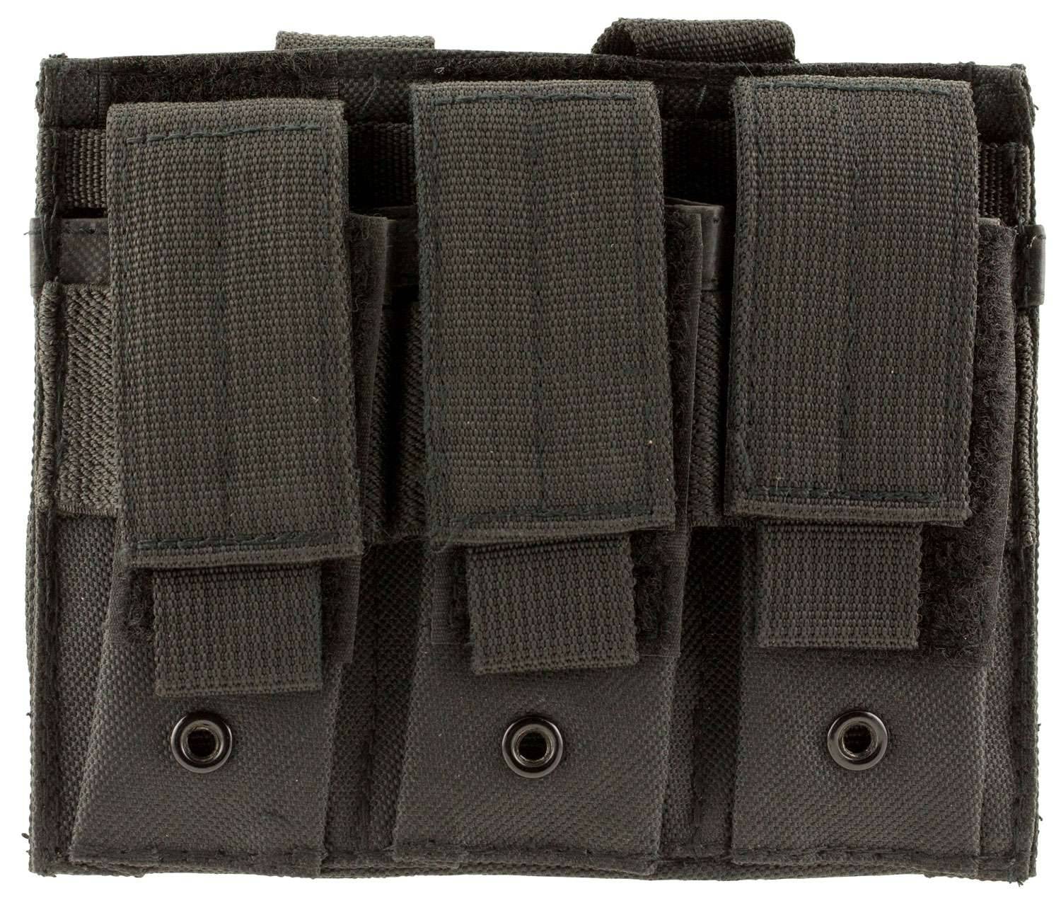 This mag pouch features three compartments to fit double stack pistol magazines, 2 snap buttons, and Molle webbing on the back panel for flexible mounting.